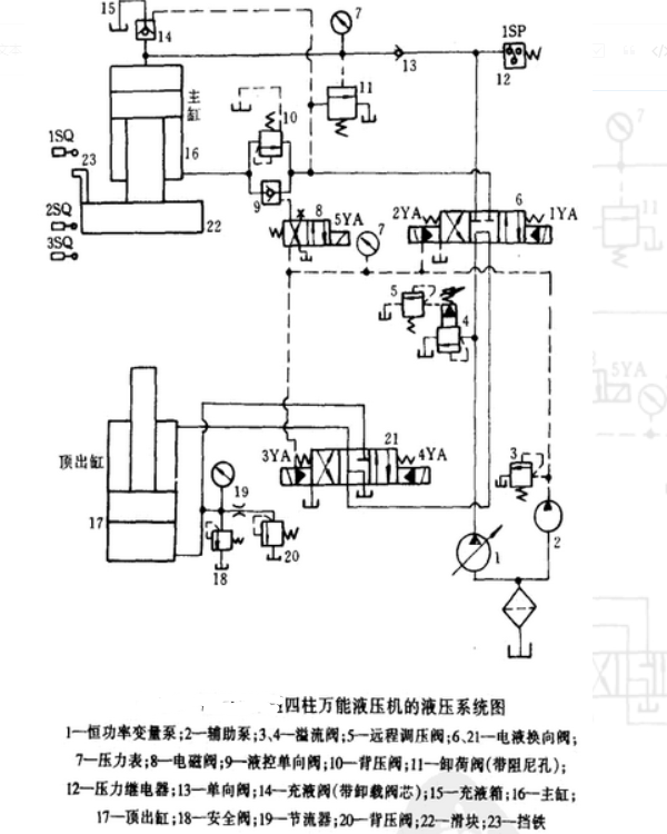 5、最后主缸停止時(shí)的狀態(tài) ,當(dāng)主缸滑塊上的鐵23按下沖程開關(guān)1SQ時(shí),電磁鐵2YA被切斷,主缸活塞被位于M功能中心的閥門6鎖定,停止運(yùn)動(dòng),返回行程結(jié)束。此時(shí),泵1油通過閥門6,閥門21返回油箱,泵處于卸載狀態(tài)。在實(shí)際使用中,主汽缸可以在任何時(shí)候停下來(lái)。